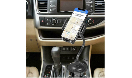 AML Designs makes hands-free device holders that easily attach to your cup holder and keeps your phone near you with a long neck for easy reading.